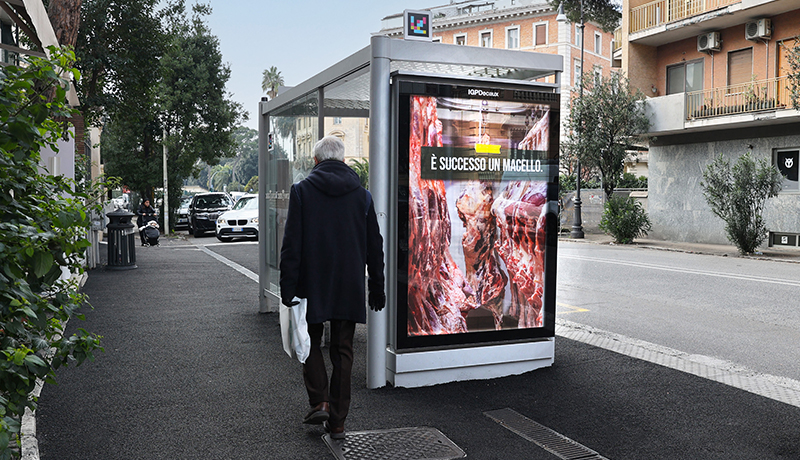 Nei primi giorni del Veganuary, le due città sono state attraversate da affissioni che mostravano mezzene di mucca e copy essenziali come “È successo un macello” o “Nessuno nasce vegano”. Nessun logo, nessun riferimento al brand. Solo un’immagine che interrompeva il flusso visivo quotidiano e costringeva a fermarsi.
