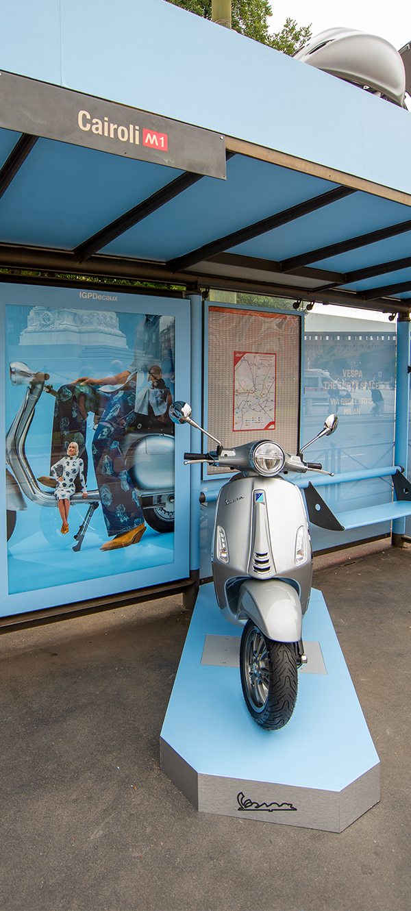 Il Team delle Brand Solutions di IGPDecaux ha saputo interpretare questa esigenza di Vespa con una strategia OOH che non si è limitata ad una semplice narrazione, ma ha amplificato il racconto attraverso una mirata attività drive-to-store. Per questo sono stati coinvolti due asset complementari: arredo urbano e dinamica: