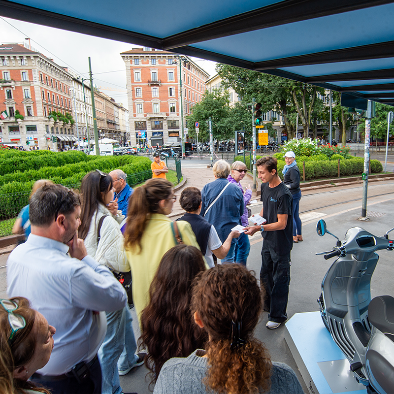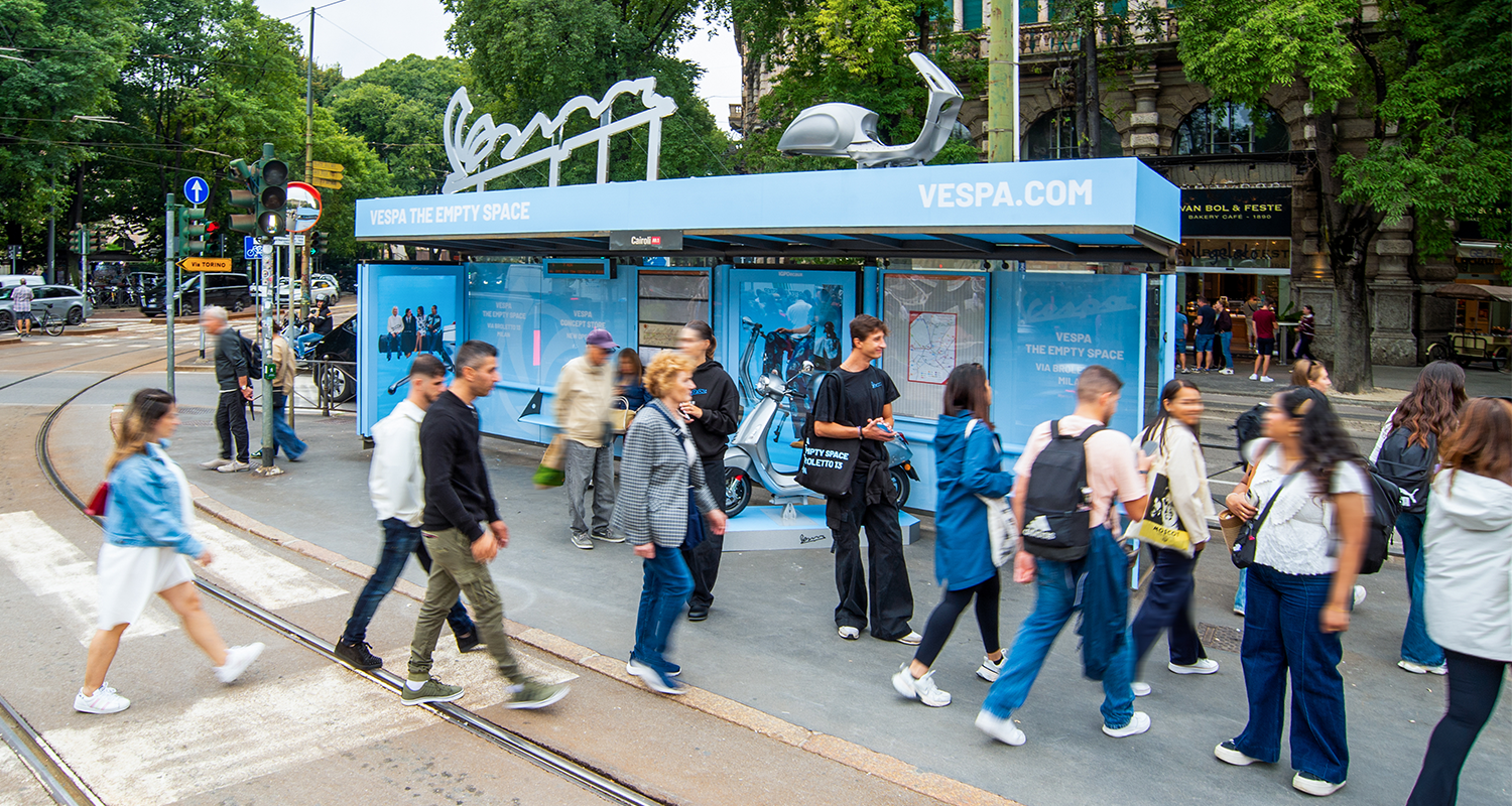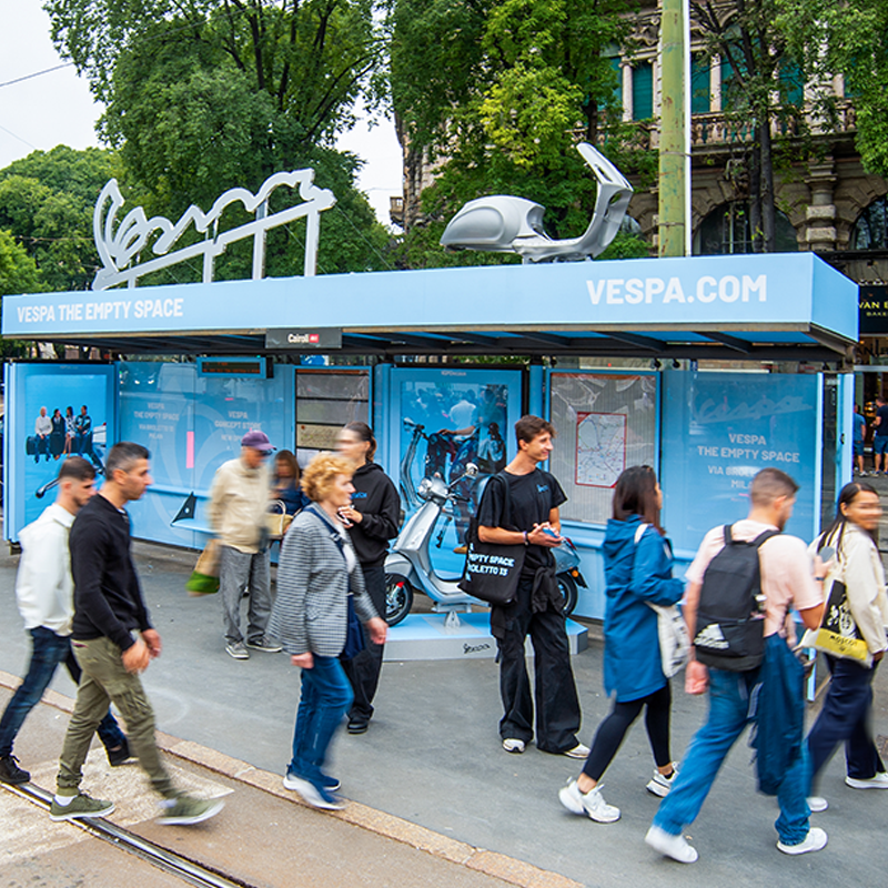 - La pensilina brandizzata Vespa in Largo Cairoli: non un semplice impianto, ma un microambiente immersivo. Un touchpoint urbano che ha trasformato l’attesa in engagement, generando traffico fisico verso lo store. Il design riprendeva i codici visivi della collezione, rendendo la pensilina un teaser esperienziale. Un gesto di branding che ha reso Vespa riconoscibile anche a chi non la cercava;