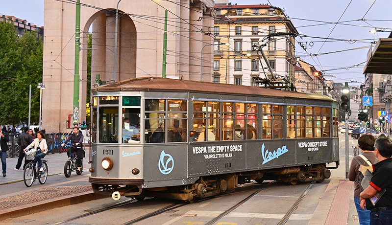 - Il tram Darsena full-wrap: un’icona in movimento. La pellicola satinata, che riprendeva texture e palette della collezione, ha trasformato il tram in una passerella mobile. Per un mese, Milano ha visto sfilare Vespa tra le sue vie, generando una campagna dinamica, memorabile e perfettamente integrata nel tessuto urbano.